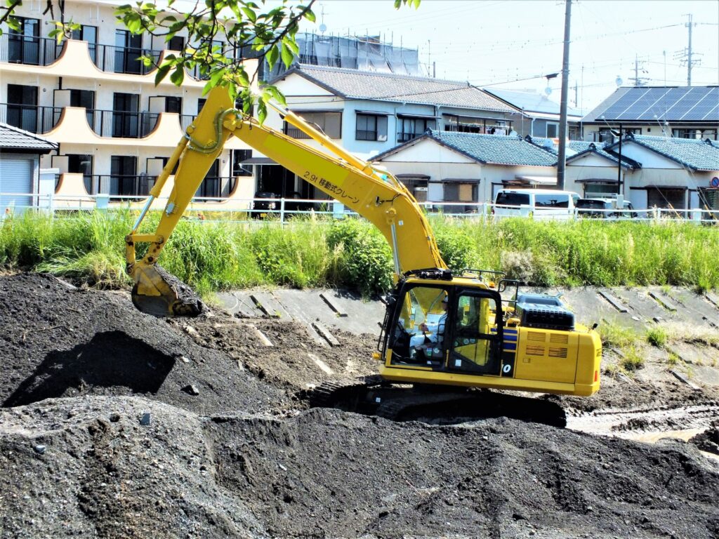 しゅんせつ工事では、河川や水路、池の底に溜まった土砂や堆積物を効率的に除去し、水の流れを確保します。